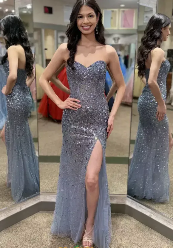 Have everyone falling in love as you enter wearing the remarkable long dress style PS25286 by Portia and Scarlett. The strapless sweetheart neckline is paired with an illusion bodice beautifully adorned with glistening beaded work that interchanges from small sequin to large beads. Cascading yet becoming sparse the beadwork changes along the bottom of the fitted skirt.