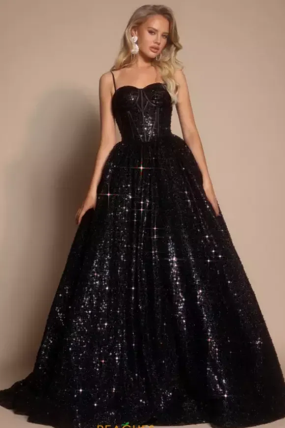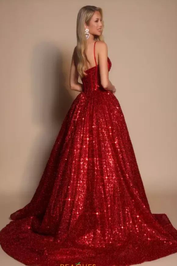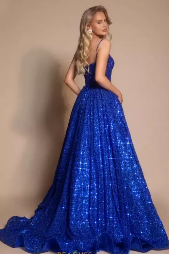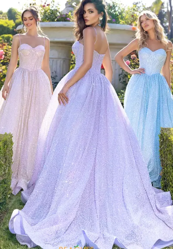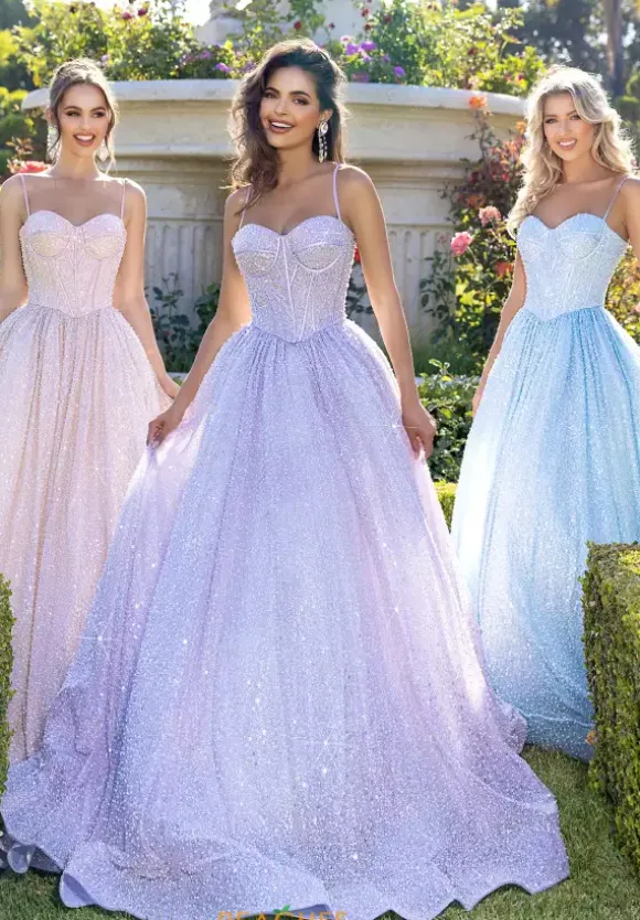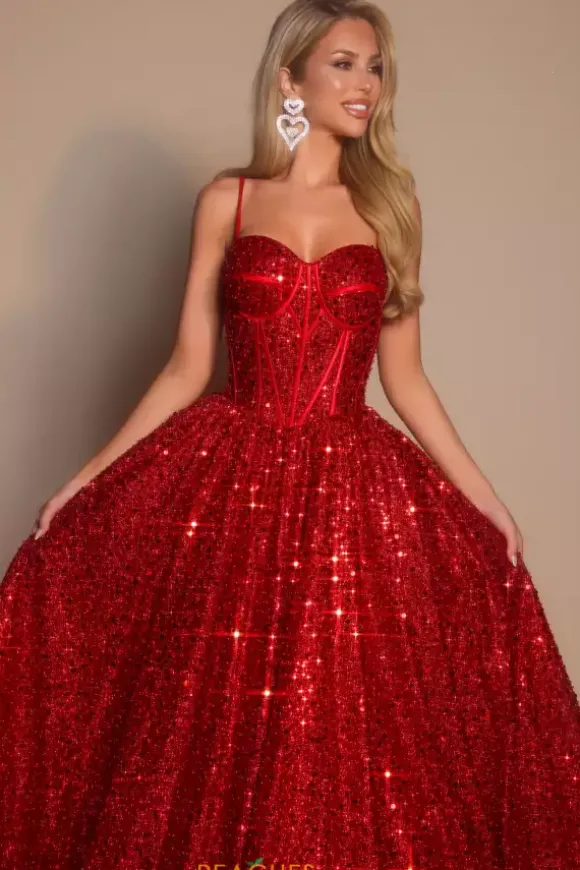 Stand out at your Prom in this Portia and Scarlett modern day princess dress style PS25308 made in completely beaded fabric. This scintillating gown features a structured corset with visible boning, sweetheart neckline, spaghetti straps and mid low zipper closure back. The full ball gown skirt has a yoked V waist and small back train.