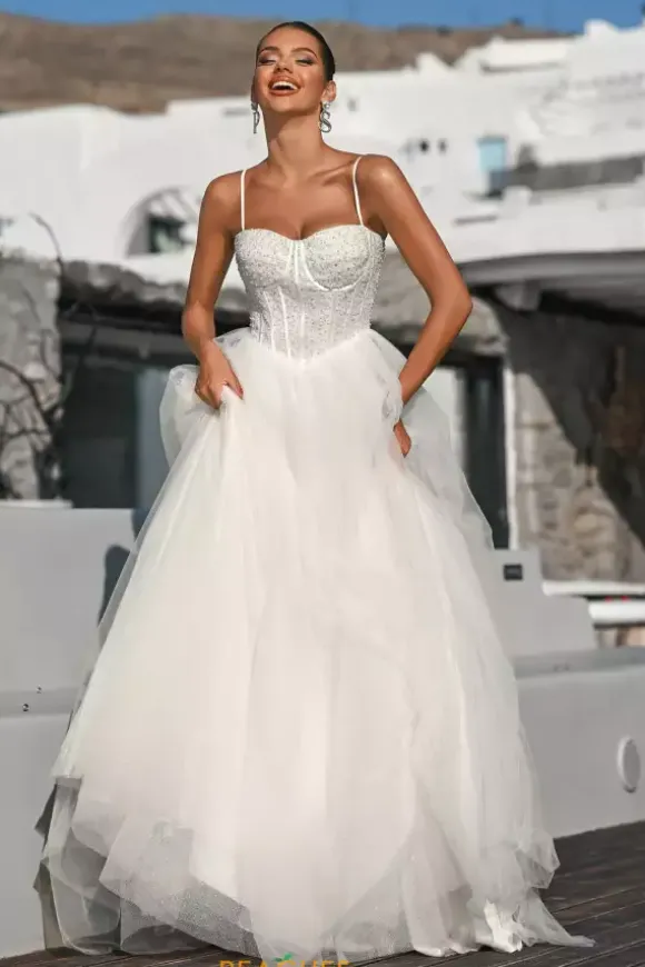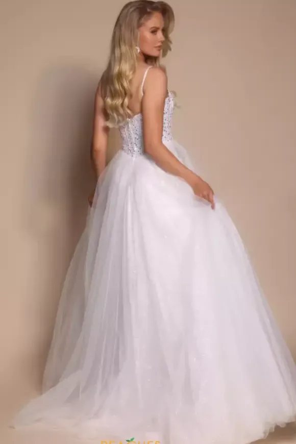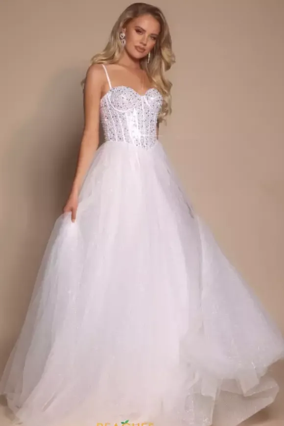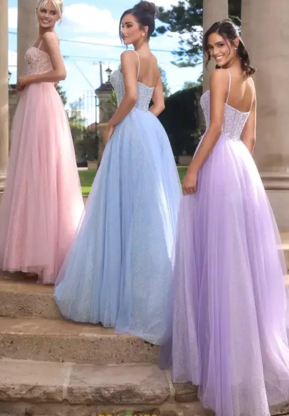 Channel your inner princess for prom and wear this shimmering Portia and Scarlett ball gown style PS25311 made of glistening tulle. Offered in a soft color pallet, this stellar silhouette showcases a completely beaded corset with visible structured boning, a sweetheart neckline, spaghetti straps and mid low zipper closure back. The long, ball gown skirt has flowing tulle layers. Gloves pictured do NOT come with this dress.