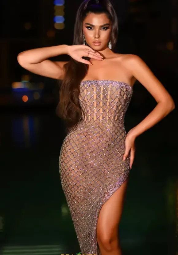 Wow the crowd in this outstanding long fitted dress from Portia and Scarlet style PS25430C. It consists of a strapless neckline where sparkling beads outline the neckline and the high thigh side slit. This number is fully embellished by an intricate bead work pattern that initiates from the bodice and goes down to the skirt.