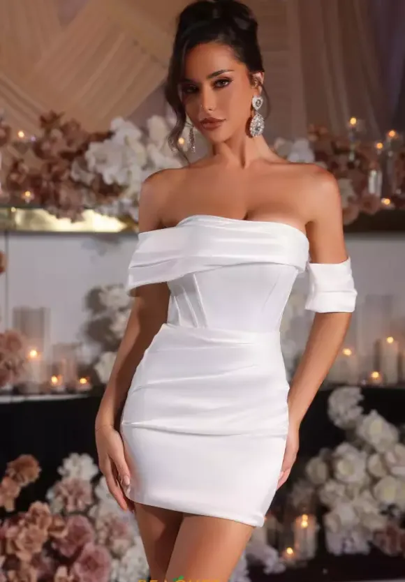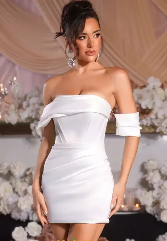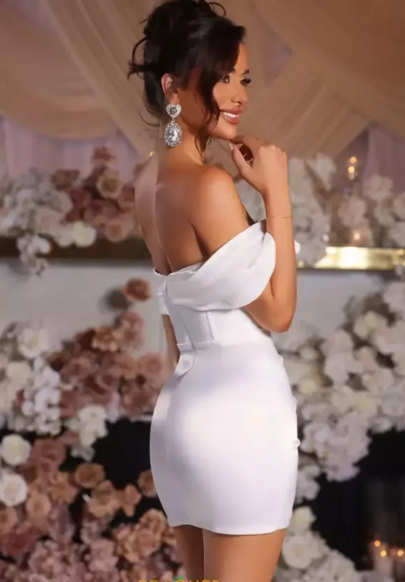 Look sleek, sexy and elegant in this stunning short fitted dress by Portia and Scarlett, style number PS25564. This gorgeous dress features a classy off the shoulder neckline with unique asymmetrical sleeves. The corset bodice and fitted skirt will hug your figure and accentuate your curves perfectly ensuring you look amazing at any event.