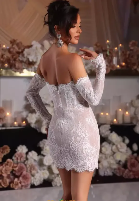 Fall in love in this extravagant short lace Portia and Scarlett style PS25570. Exude elegance in this gorgeous ensemble adorn in lavish lace highlighting lovely scallop trimming. Showcasing a strapless sweetheart neckline, edgy off the shoulder long sleeves give this dress a dramatic touch. The fitted short silhouette defines your waistline accentuating your curves.