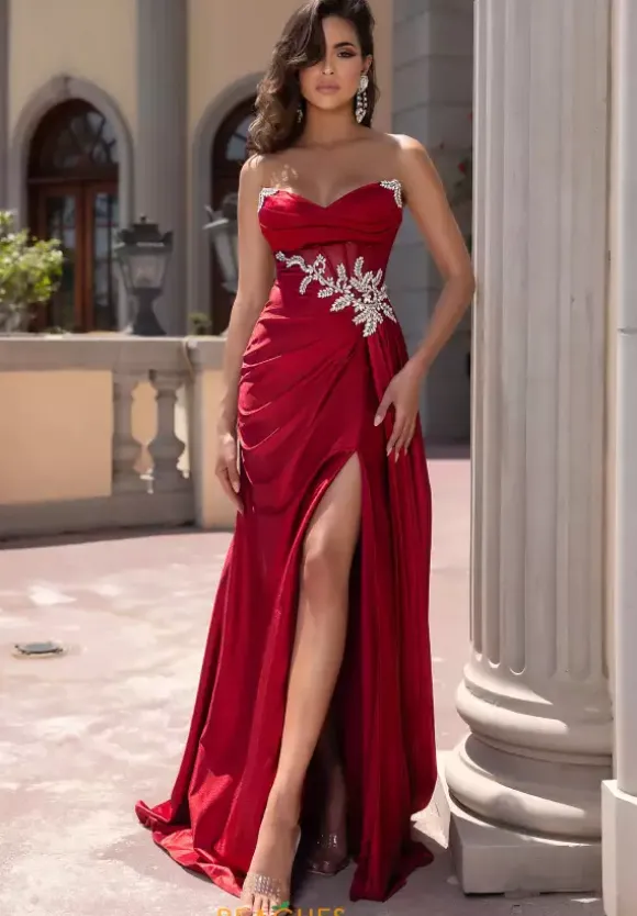 Be the lady in red in this jaw dropping Portia and Scarlett dress style PS25616E. The strapless sweetheart neckline has peak rhinestone details that match the rhinestone beading that angles across the midriff of the bodice. The flowing jersey material is ultra flattering and has a thigh high front side slit.