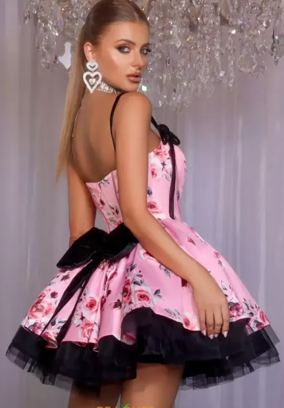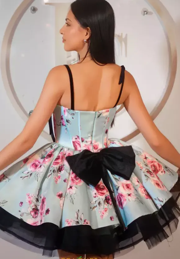 Show off your fashionable side and rock this short a line dress from Portia and Scarlett style PS25765 to your homecoming. This floral inspired printed dress has a stunning structured bodice and bold black straps with bow details. The full a line skirt has a ribbon of black tulle that trims the bottom of the skirt.
