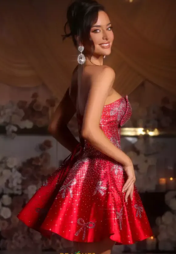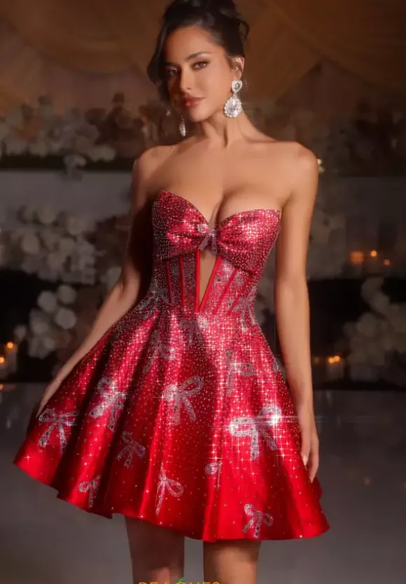 Glimmer and shine at your social event wearing this short A line dress by Portia and Scarlet, style PS25785. This illuminating dress showcases a charming strapless sweetheart neckline with a bedazzled bow attached. The bodice showcases a built in corset with a key hole making it very flattering. The dress then flows out into a fun skirt with beaded bows all around.