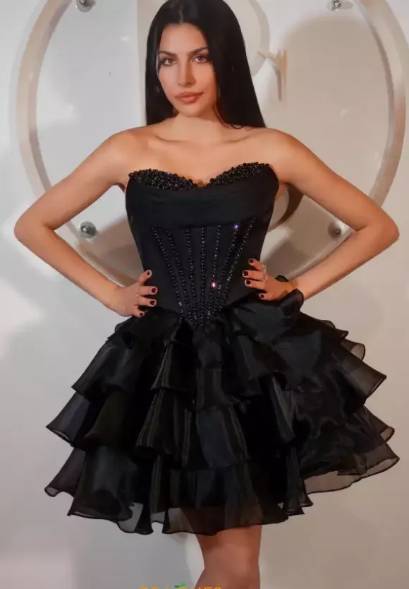 Look classy and elegant in this gorgeous short A line dress by Portia and Scarlett style number PS25796. This dress features a classic strapless sweetheart neckline with peak a boo beaded cups and a structured corset bodice with exposed beaded boning for extra flair. The entire skirt is made out of the delicate organza material that flows effortlessly.
