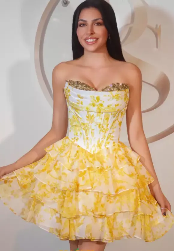 Show off your elegant and dainty side in this gorgeous short A line dress by Portia and Scarlett style number PS25798. This dress features a classic strapless sweetheart neckline with peak a boo beaded cups and a structured corset bodice with exposed boning that will accentuate your figure flawlessly. The skirt is made out of a delicate chiffon material that flows effortlessly.