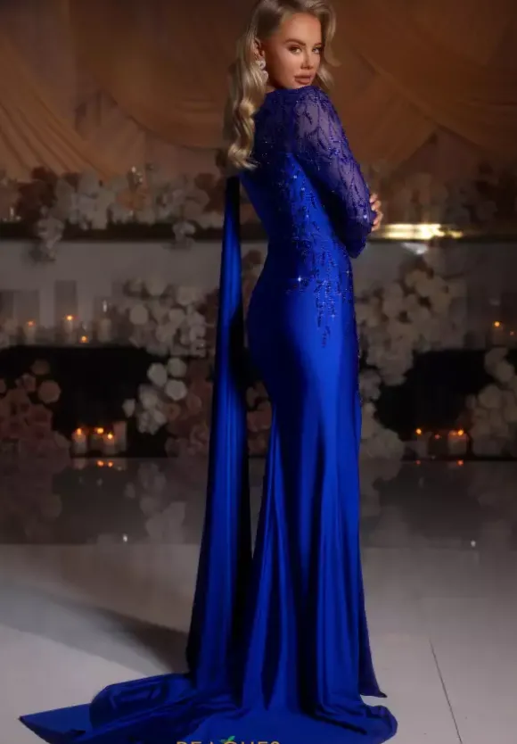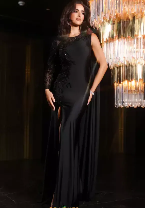 Show off your unique sense of style in the classic long fitted dress short fitted dress by Portia and Scarlett style number PS25861E. This elegant gown features a timeless high neckline with a mesh embellished sleeve and an overlay cape opposite to the sleeve. The dramatic vibe of this dress paired with the thigh high slit and the long sweep trail will guarantee all eyes on you.