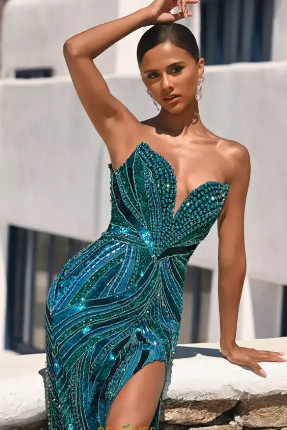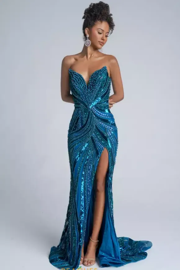 Bedazzle the crowd in this long fitted Portia and Scarlett dress style PS25984C. This v neckline strapless dress is beaded with exquisite detailing. The combination of rhinestones, beads and sequin swirl perfect throughout the dress. A front thigh high side slit and sweeping train complete the look. This is the long dress in the middle.