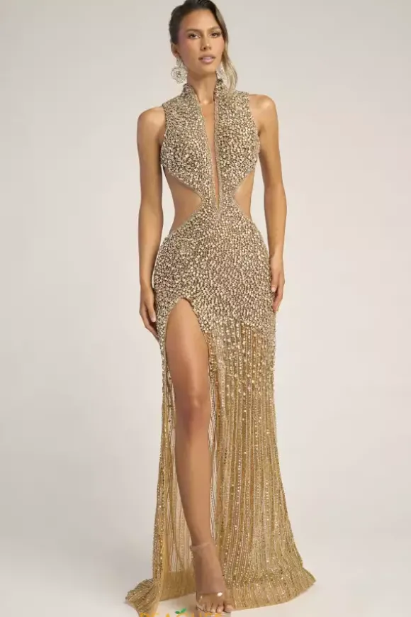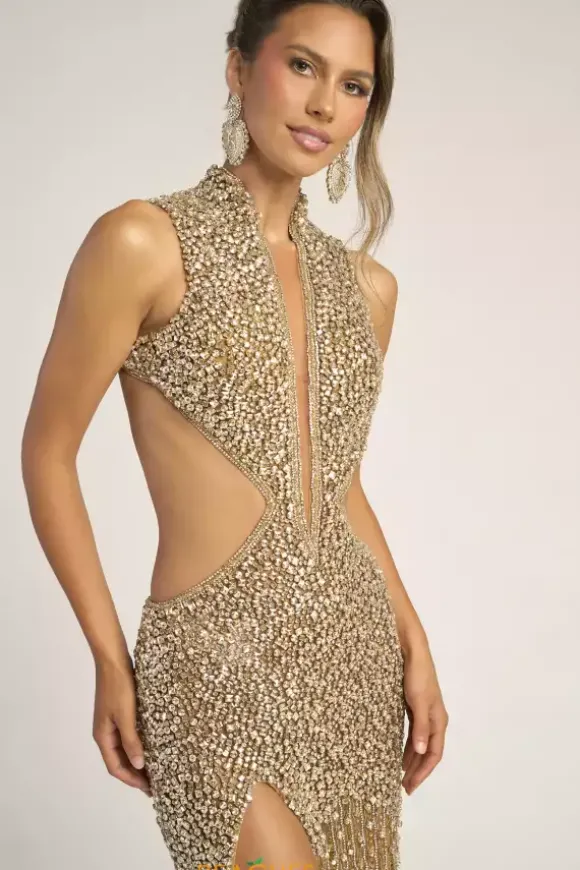 Stand out from the rest in this jaw dropping Portia and Scarlet long dress PS25988C. Available only in this gorgeous peacock color, this dress has an unique plunging deep v neckline with a raised collar. The sides of the dress are cut out to define your shape. The long fitted skirt falls to the floor with stunning bead work.