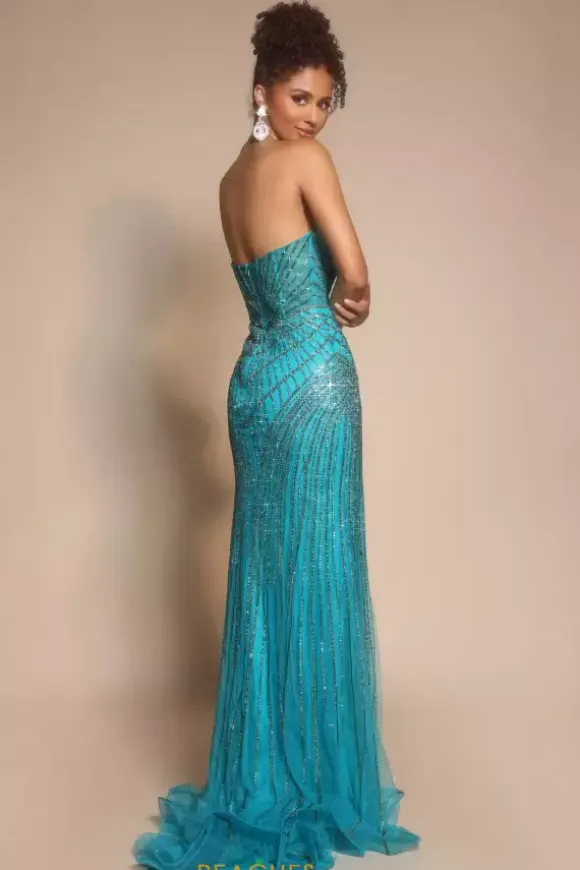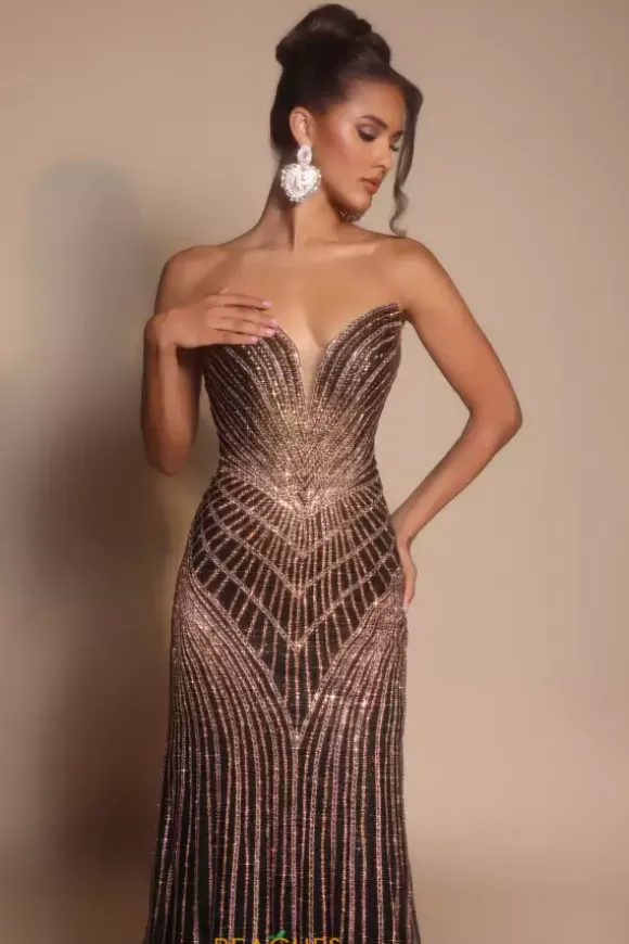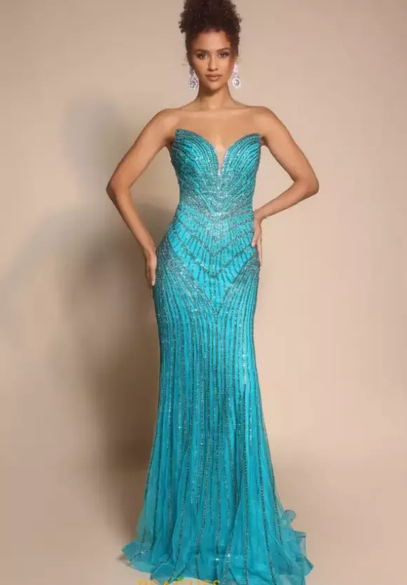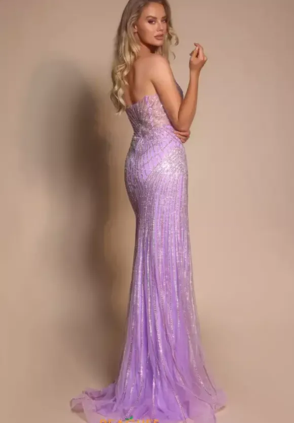 Exude elegance wearing this scintillating Portia and Scarlett PS26004 embellished with slimming lines of radiant beading sculpting your figure beautifully. The sensational silhouette showcases a strapless fitted bodice with a V neckline and low zipper closure back. The long straight skirt flows to floor with a horsehair hem edge.