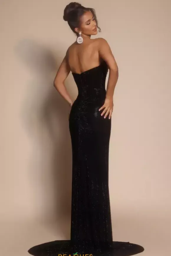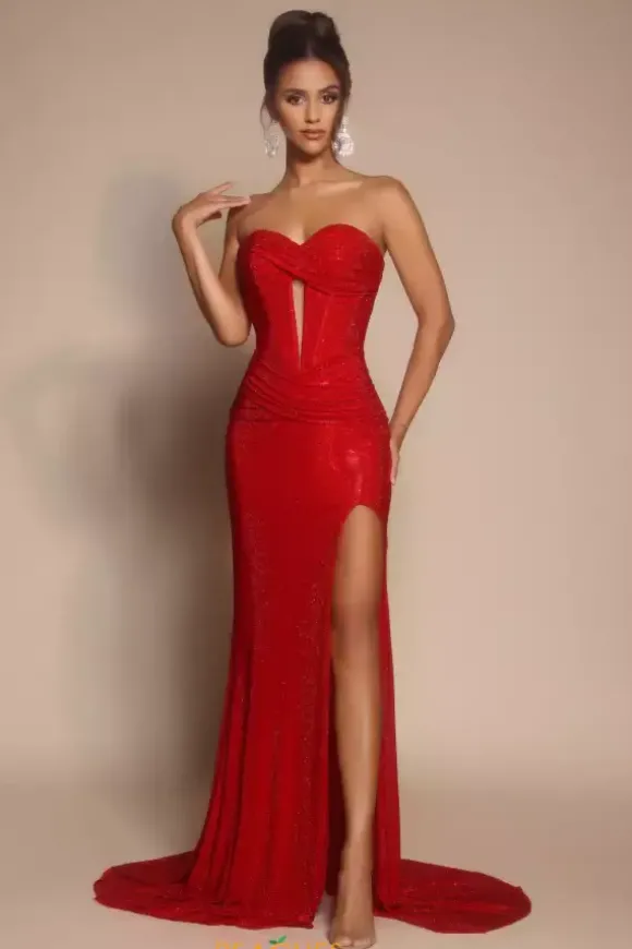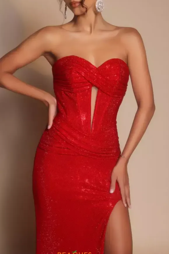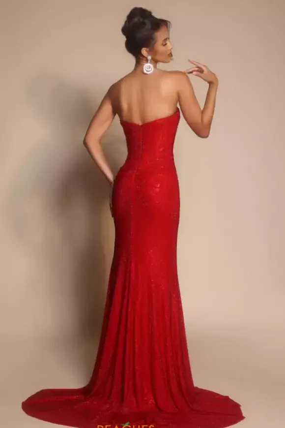 Have all eyes fall on you wearing Portia and Scarlett long dress PS26026. This timeless fitted dress showcases a lovely sweetheart strapless neckline paired with an accentuating built in corset bodice. The all over glitter material features a daring thigh high slit and absolutely mesmerizing must have sweep train.