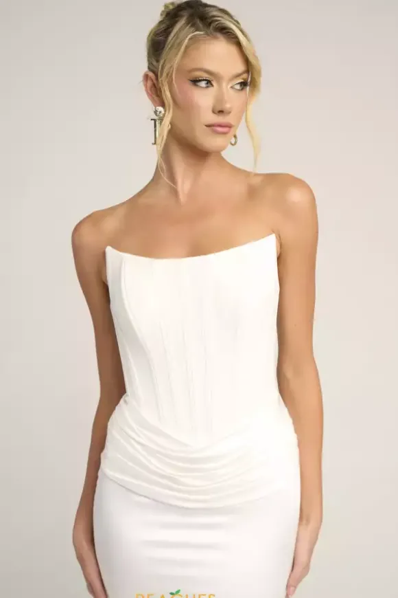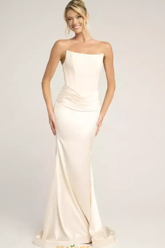 Sleek sophistication exudes when you wear this classic Portia and Scarlett long dress style PS26032 to your next social occasion. Made in rich satin colors, this phenomenal gown features a strapless corset bodice with a scoop neckline, visible boning and V back with zipper closure. The long slim skirt has pleating at the waist and backside ruching.