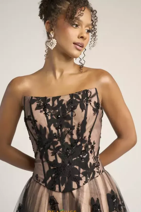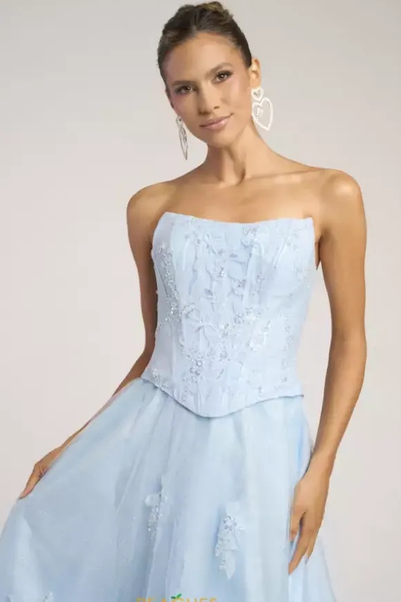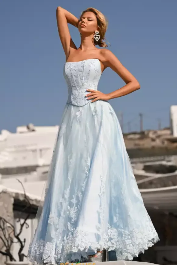 Look and feel aesthetically pleasing in this beautiful A line dress designed by Portia and Scarlett style, PS26061. Showcasing a simple yet elegant strapless scoop neckline and a fully structured fitted corset. This entire piece is fully embellished in amazing applique and lace work, achieving a soft beautiful look.