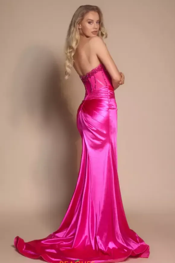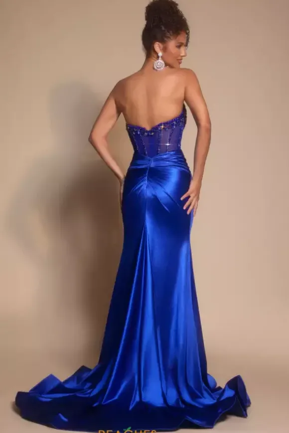 Look and feel your best wearing Portia and Scarlett long dress PS26073. This figure flattering silhouette reveals a straight across strapless neckline complimented with an accentuating beaded and lace corset top. The shiny simple stretch satin shows off a thigh high slit and sweep train ensuring to leave a lasting impression.
