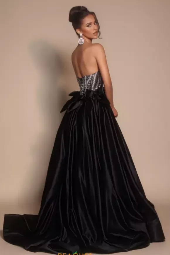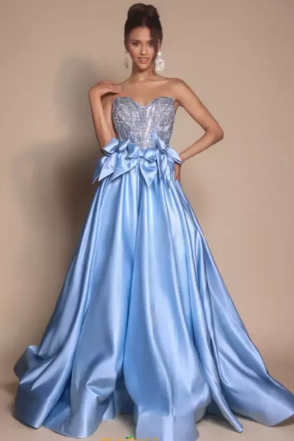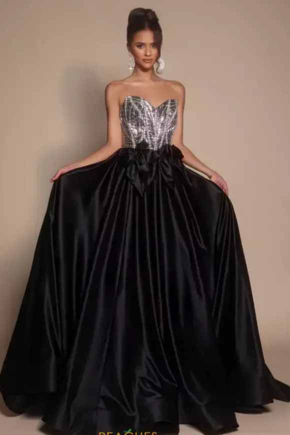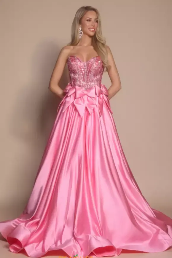 Feel like a modern day princess in this sleek Portia and Scarlett ball gown style PS26077. The beautifully bejeweled strapless sweetheart neckline bodice shimmers from all angles. The a line satin skirt is met at the with large bow details that wrap around you waistline defining your shape..