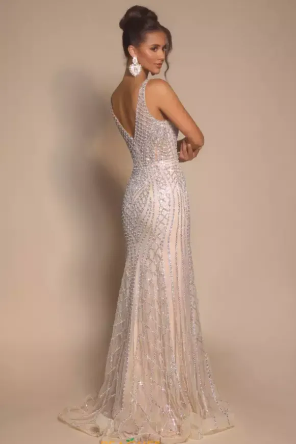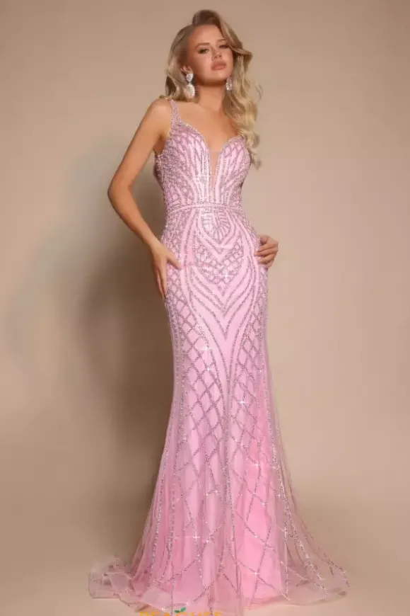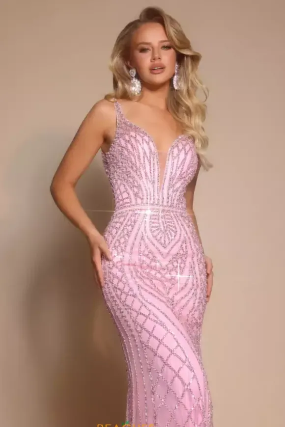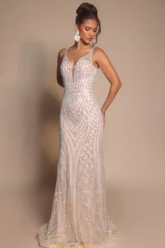 Be the center of attention at any event you attend when you wear this stunning long fitted dress by Portia and Scarlett style PS26089. This ensemble features a plugging v neckline followed by two straps for support. The bodice is fully detailed in glistening beadwork that will have you shine from any angle.