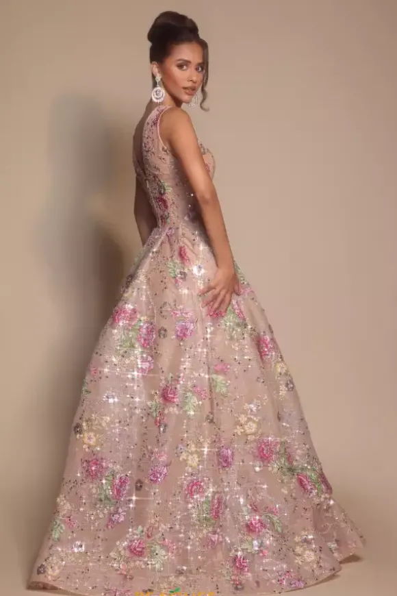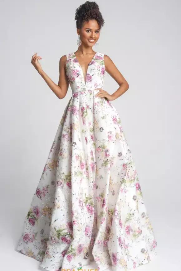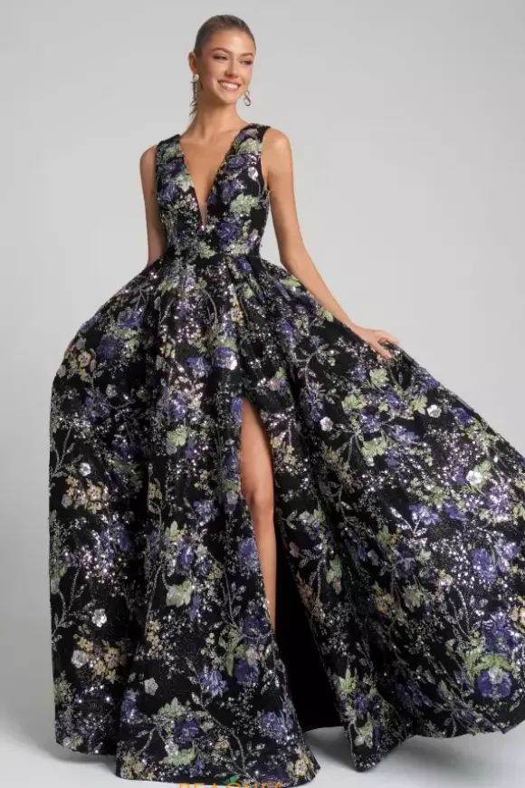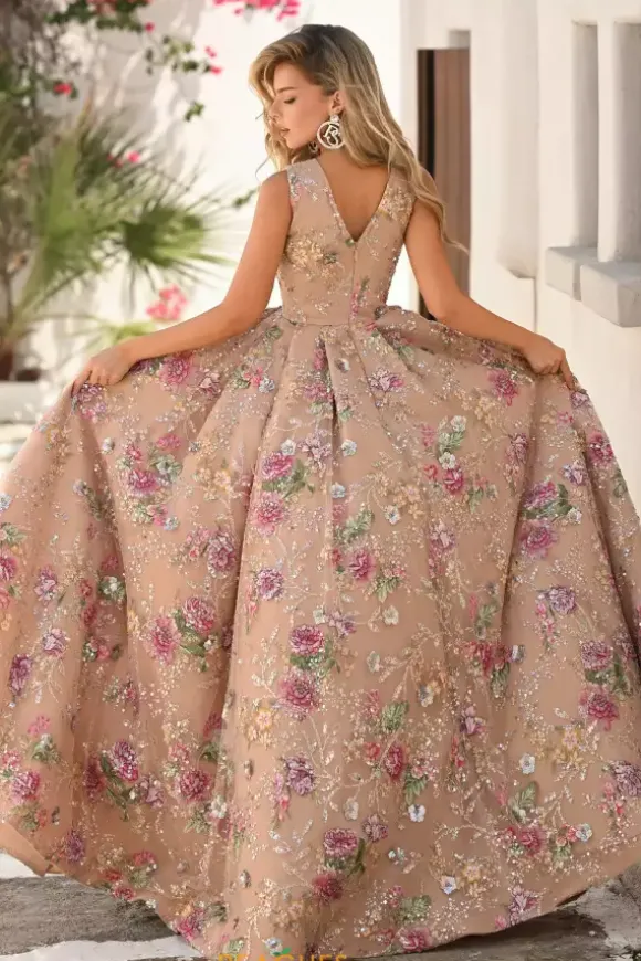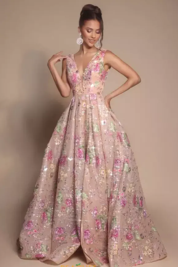 Feel like a modern day fairy princess when you show up wearing this enchanting long A line ball gown by Portia and Scarlett style PS26091. This design showcases a classic v neckline with mesh in the middle for coverage. Fully detailed in the perfect mix of floral applique and unique beadwork makes the girly dress complete.