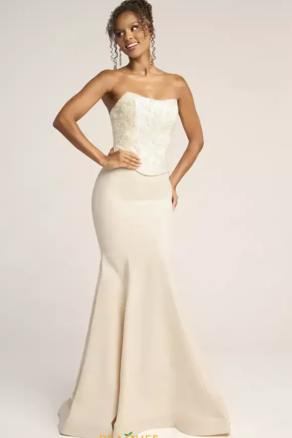 Feel classy and regal in this long fitted dress designed by Portia and Scarlett style, PS26092. This lovely two piece dress features a strapless scoop neckline and a corset lace up bodice designed with breathtaking lace and applique. The satin skirt is perfect for exuding elegance with a phenomenal long sweep train.