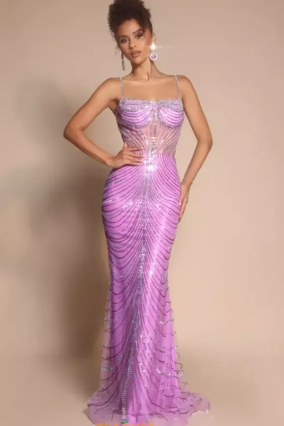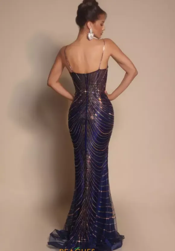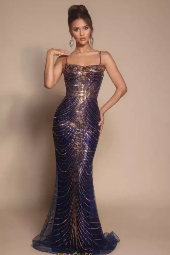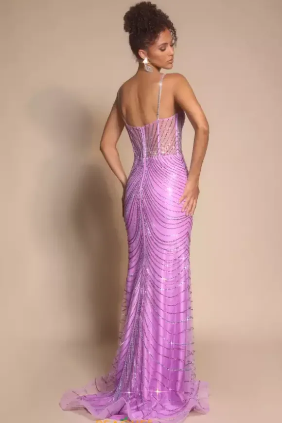 Be the best dressed this prom season in this refined Portia and Scarlett zip up Prom dress style PS26095. Radiant dainty beads adorn this no slit sweep length dress from top to bottom in a sophisticated draped fashion that is featured across the classy scoop neckline. The skirt is completed with a tulle train.