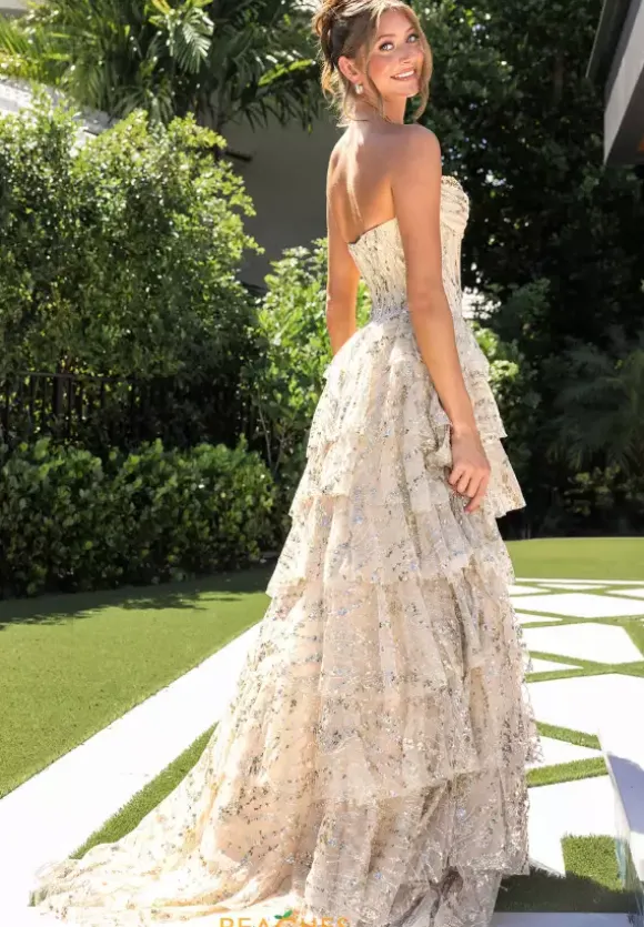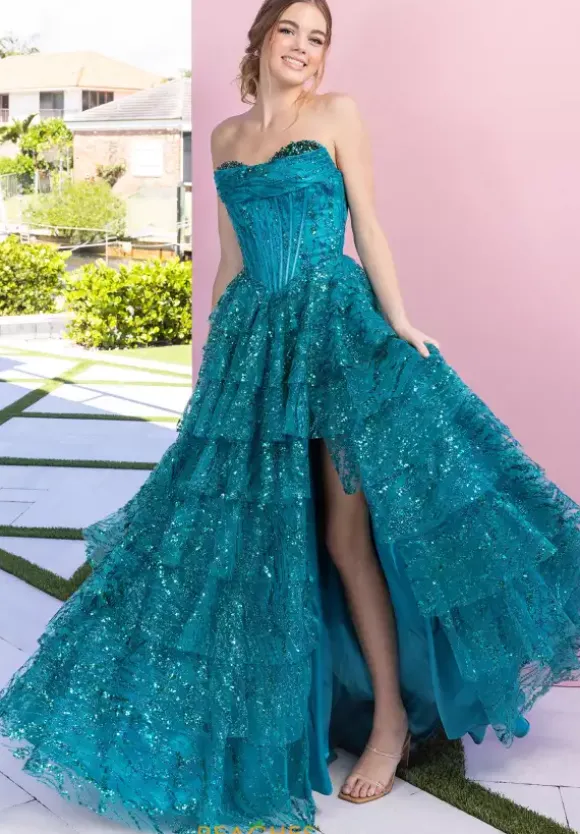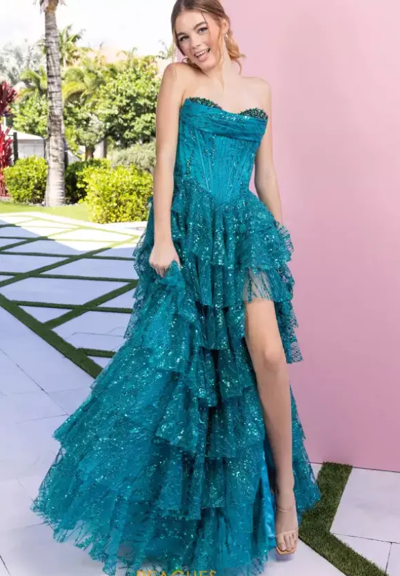 Be the most memorable in this unforgettable Portia and Scarlett ball gown style PS26099. Eye catching color matching stone accents garnish the strapless sweetheart neckline of the sequin beaded corset bodice. Frilly sequin encrusted tiers of glittering tulle cascade into a lavish sweep train.
