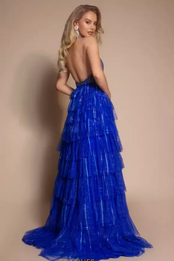 Bring out your unique side in this stunning long A line dress designed by Portia and Scarlett style, PS26117. Showcasing a one of a kind halter top with a deep V neckline and a charming open back . Shimmer at every angle with the skirt made up of glitter tulle and glistening ruffle layers. Touch up the look with the flattering slit.