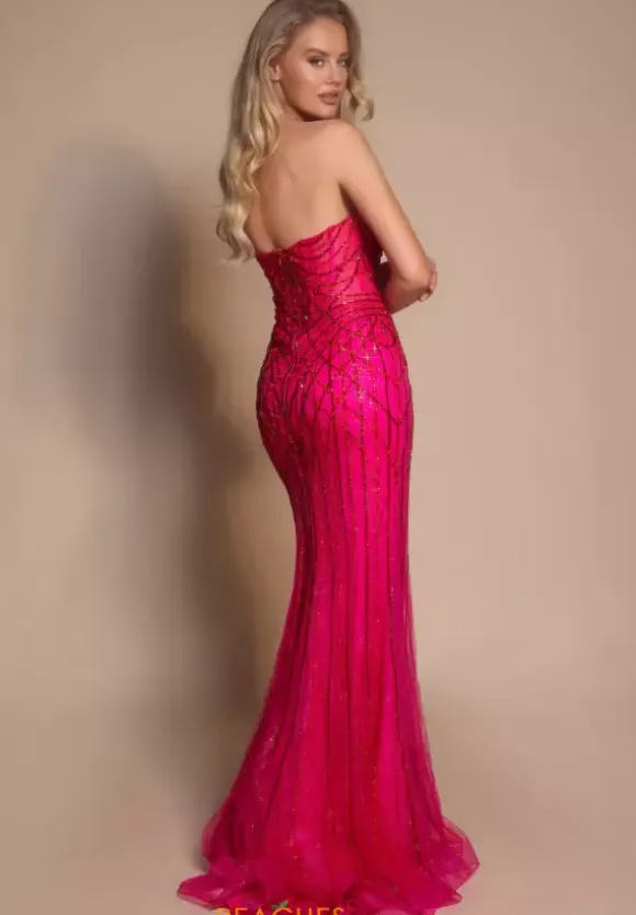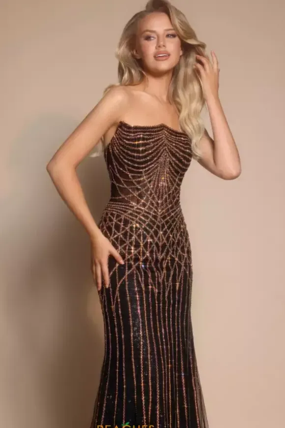 Feel like your are walking the red carpet while wearing Portia and Scarlett long dress PS26130. This absolutely striking fitted dress showcases unique strapless neckline with a full zip up closure. Stand out effortlessly with the all over intricate patterns of dazzling and radiant sequins adding the glitz and glam.
