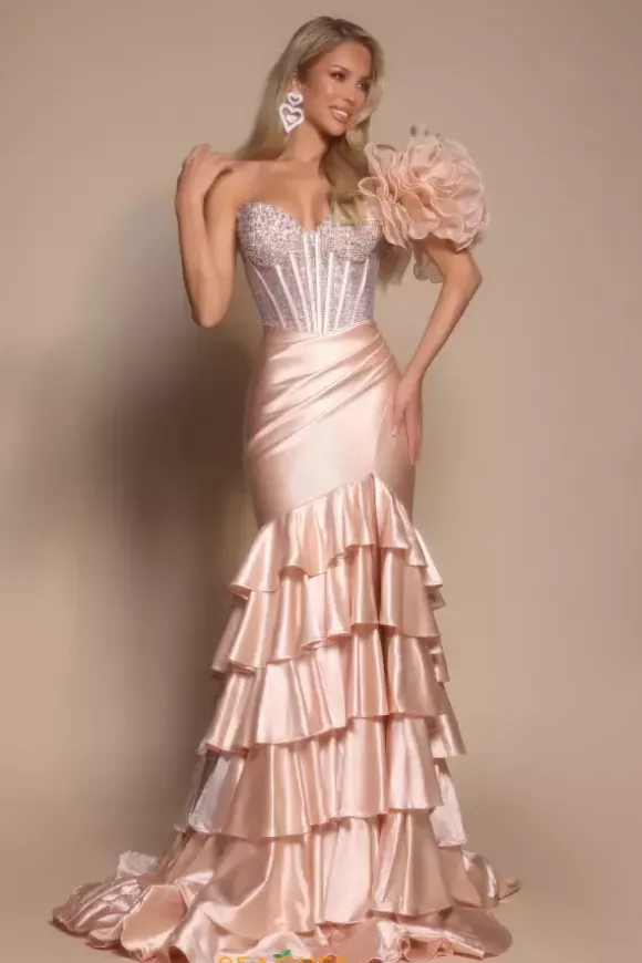 Show up and stand out at your next event in this chic long fitted dress designed by Portia and Scarlett style, PS26141. Featuring a strapless sweetheart neckline paired by a single shoulder detailed cap sleeve. The corset is adorned in dazzling beadwork leading down to a luxurious stretch satin skirt with ruffle layers. Finish off this look with the superb slit and long train.