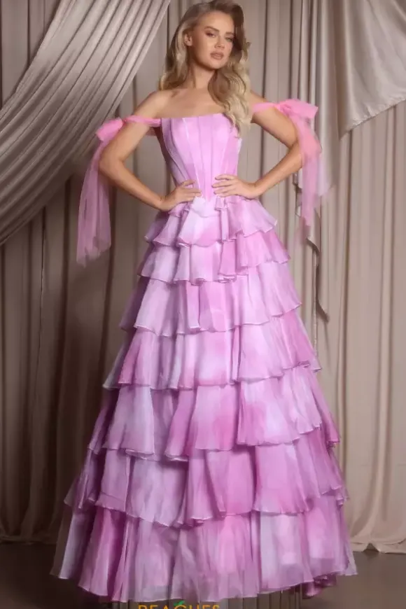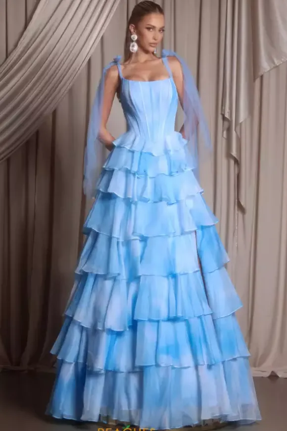 Look like a dream in this vivacious Portia and Scarlett chiffon ball gown style PS26143. This waist snatching and hip enhancing closed skirt dress displays off the shoulder tulle bow cap sleeves along with a voluminous frilly tiered sweep length skirt. The delicate chiffon fabric has a pattern that resembles the sky.