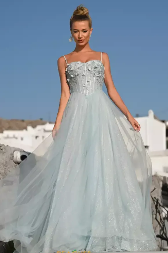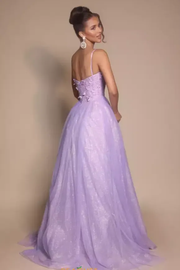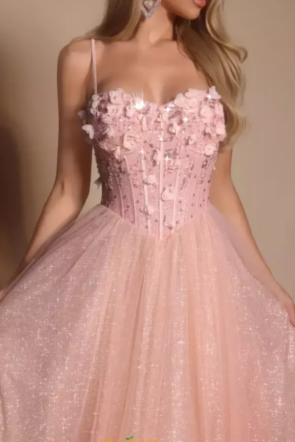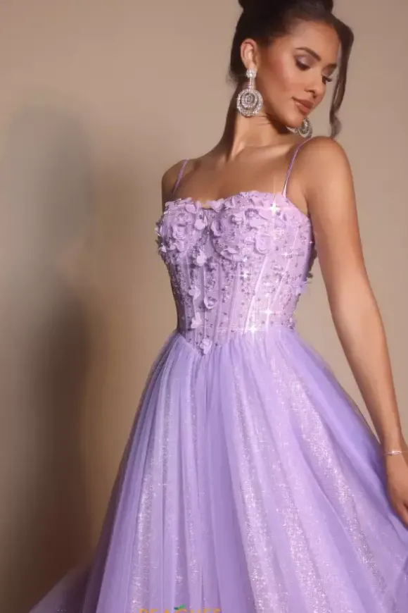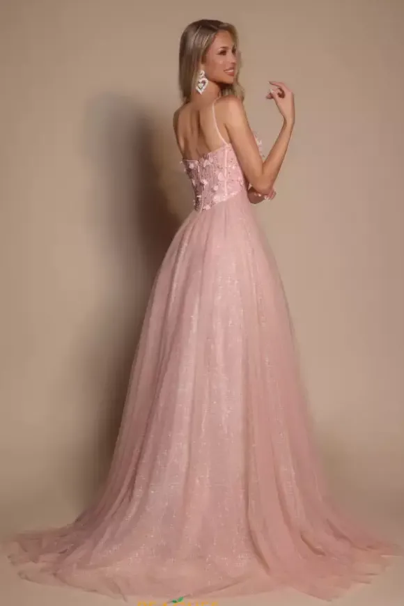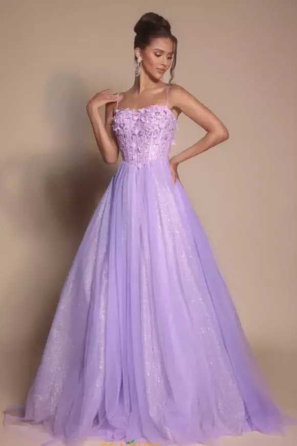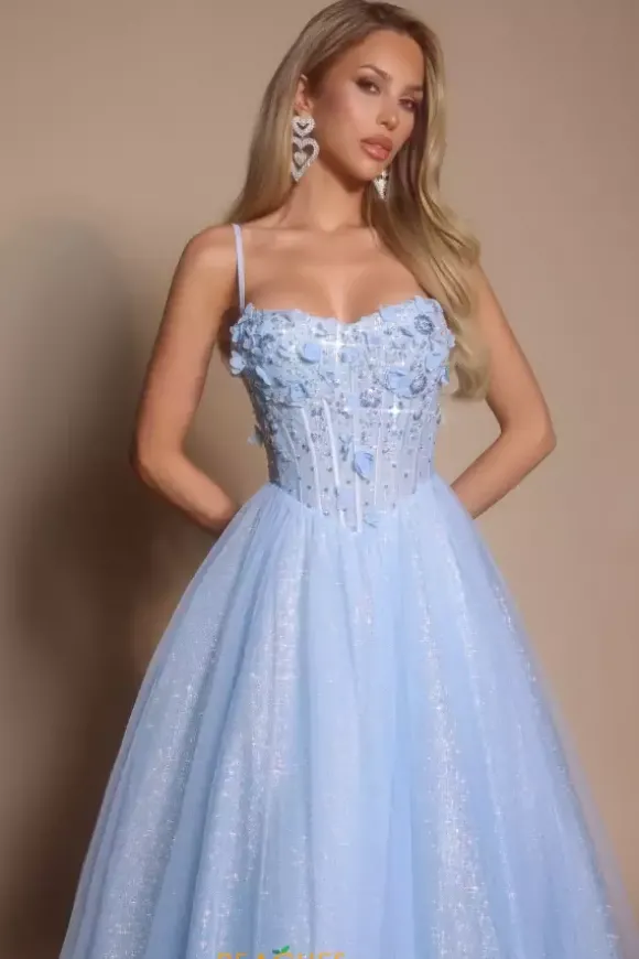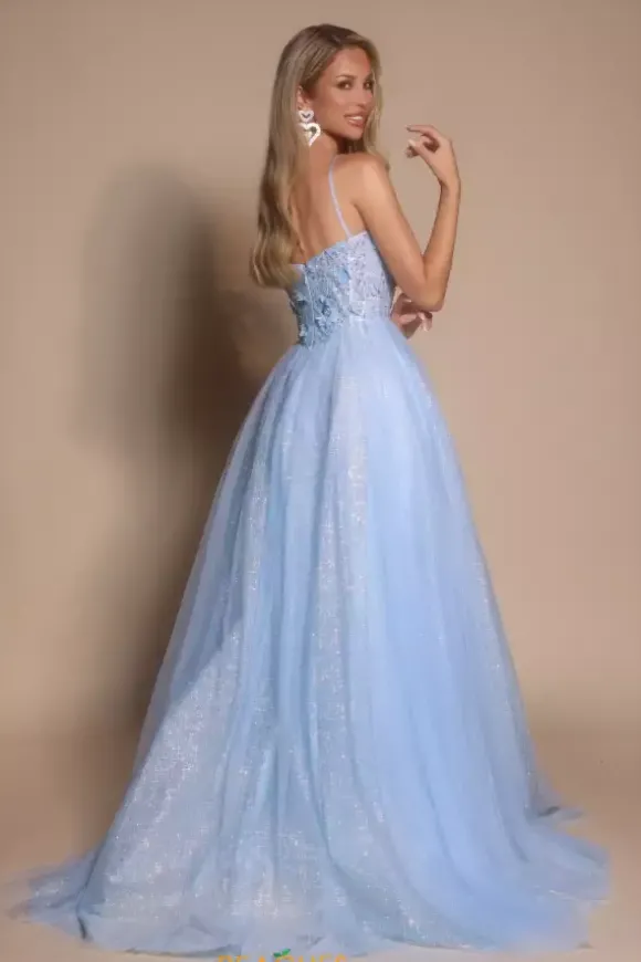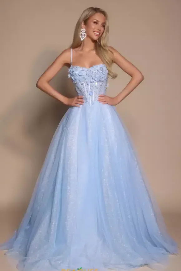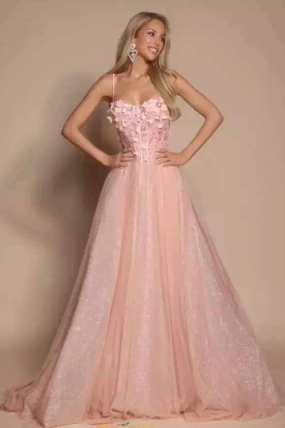 Be the embodiment of glitter in this shimmering princess silhouette Portia and Scarlett ball gown style PS26146. Three dimensional delicate flower appliques decorate the fitted sweetheart corset bodice amongst the glittering fabric that cascades into a no slit glittering tulle sweep length skirt.