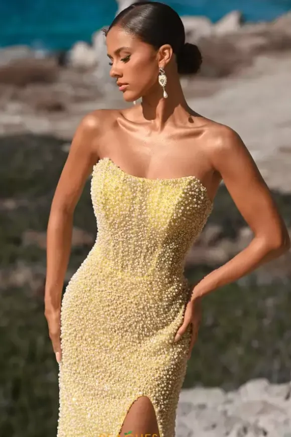 Look and feel your best wearing Portia and Scarlett long dress PS26173 at your special occasion. This striking fitted dress showcases a flattering scoop strapless neckline paired with an accentuating corset bodice. Completely embellished with dazzling beads and trendy pearls, this style finishes with a slit and sweep train.