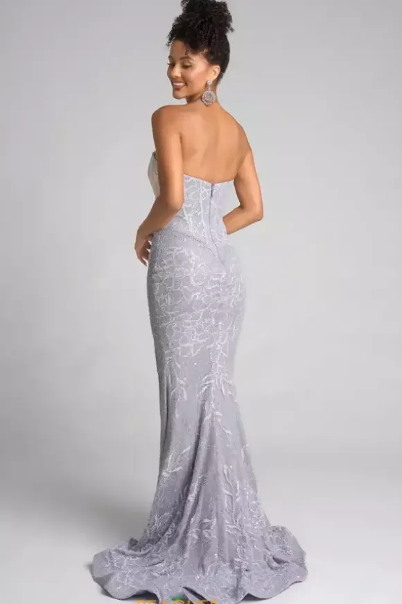 You can never go wrong in a striking all over lace dress, especially from Portia and Scarlett like style number PS26223. The strapless scoop neckline corset inspired bodice features gorgeous lace material with expose boning detail over it. The wrap style skirt ruches to one side to be ultra flattering right above the thigh high front side slit.