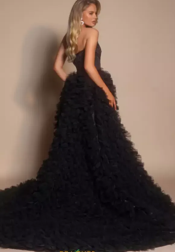 Be runway ready in this stunning Portia and Scarlett gown, style PS26236. This captivating dress features a strapless scoop neckline that pairs beautifully with a structured, beaded bodice showcasing a built in corset for a flawless fit. The skirt flares out dramatically with voluminous layers and a daring thigh high slit, creating a truly show stopping look.