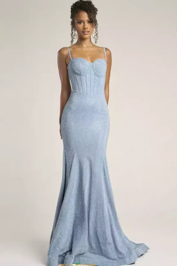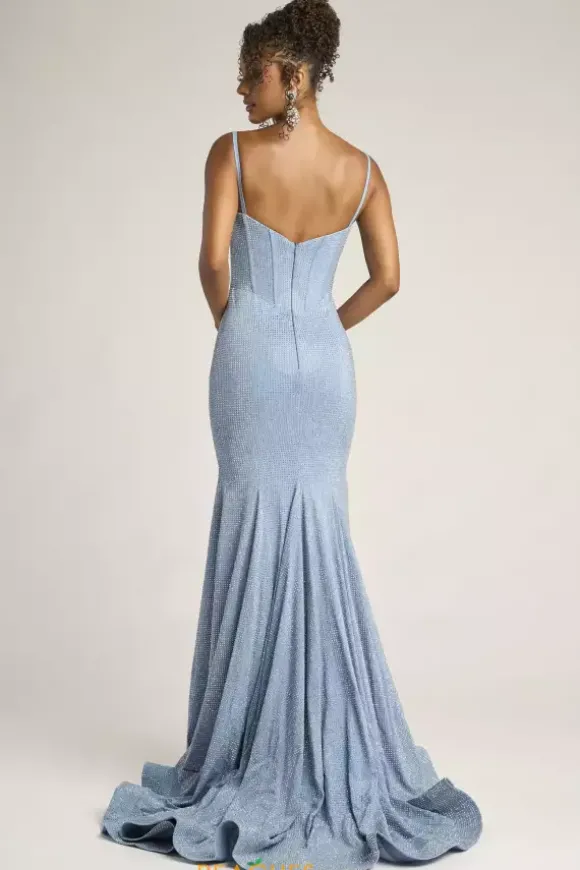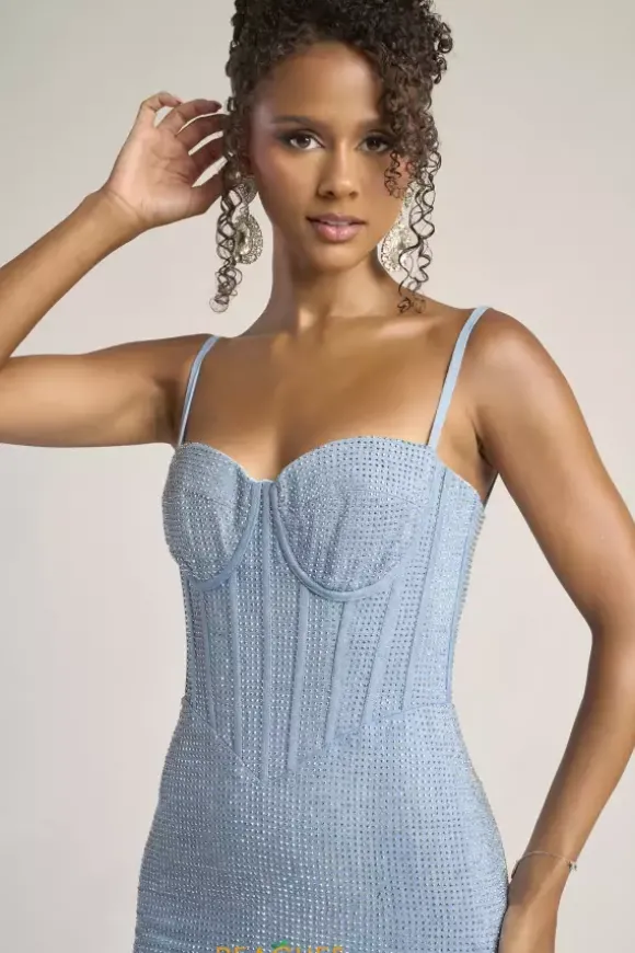 Be the only one in the room wearing this one of a kind denim silver sweep length Portia and Scarlett Prom dress style PS26258. This trendy fitted dress is ultra curve enhancing with a zip up corset bodice and no slit fitted skirt that hugs your hips. Shimmering sparkles are perfectly placed throughout the entire dress.