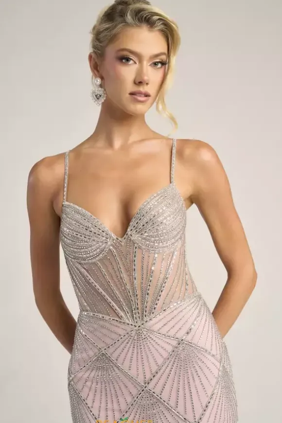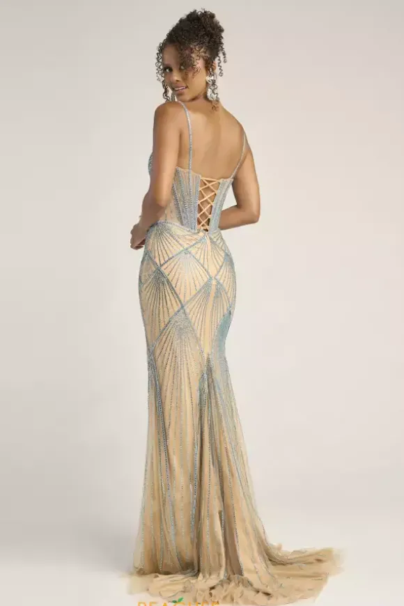 You will not go unnoticed when this bedazzled Portia and Scarlett Prom dress style PS26263 shines from every angle. This zipper closure corset dress is supported by dainty spaghetti straps that match the beadwork of the deep v neckline and mimicking beadwork of the bodice. Diamond shaped patterns shimmer throughout the sweep train skirt.