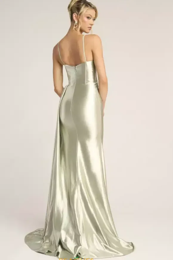 Radiate in this sleek Portia and Scarlett long fitted dress style PS26270. The bodice of this dress has a v neckline corset inspired bodice with multi color floral inspired appliques. The waist line is sheer leading to a long fitted satin skirt. A side train hangs from your hip right above the thigh high front side slit.