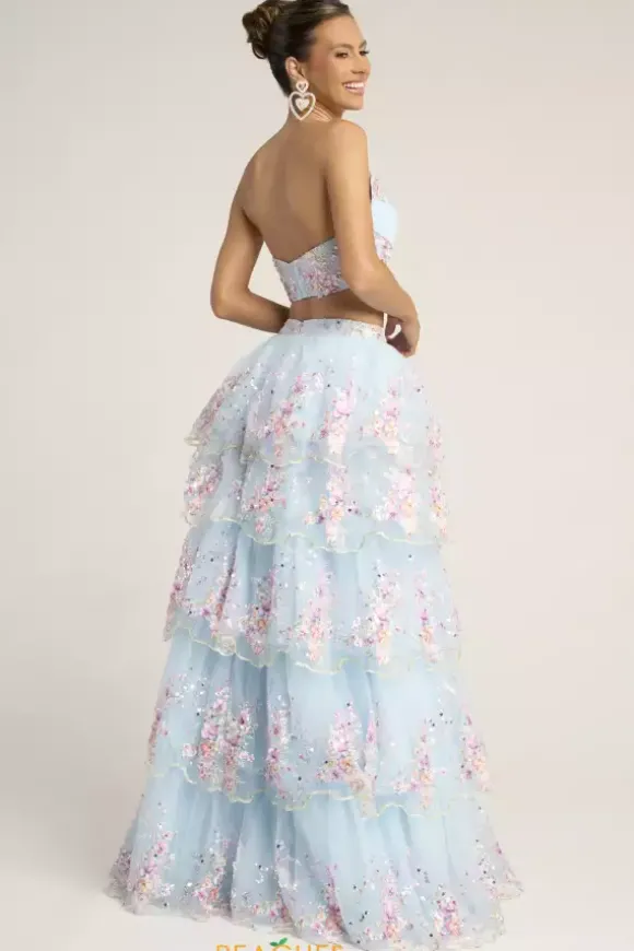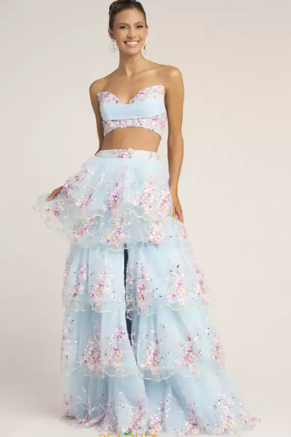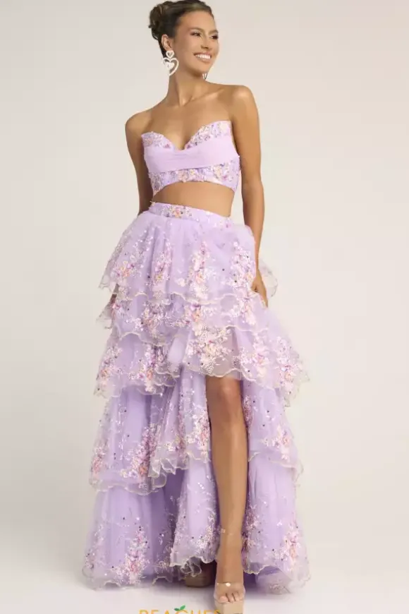 Rock this two piece dress Portia and Scarlett dress to your prom. Style PS26272 showcases a bandeau style crop top that is strapless and has a v neckline. The a line skirt has multi tiered layers of tulle embellished with multi color floral appliques. The appliques tie into the top of the dress bring the look together.