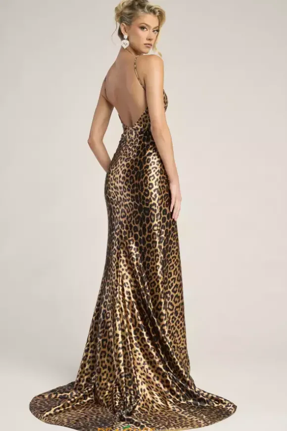 Fierce and sexy describes this tight fitted leopard print Prom dress style PS26276 by Portia and Scarlett. This sexy leopard print satin dress flaunts a trendy v neckline supported by dainty spaghetti straps that lead into a dramatic low open back above the lavish sweep train. Gathered ruching is featured on the bodice and a daring high rise slit is featured on the skirt.