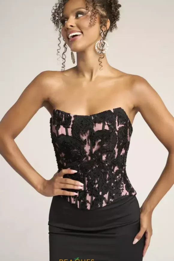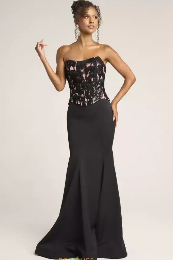 Exude sophistication when you wear this gorgeous Portia and Scarlett long dress style PS26301E. This impeccable gown showcases a corset bodice with nude lining on the black adorned with beaded appliques with a strapless scoop neckline and low back with zipper closure. The long slim skirt flows to the floor with a horsehair hem edge and sweeping back train.