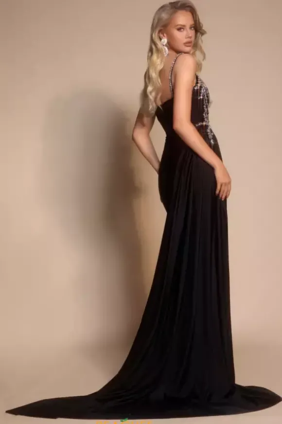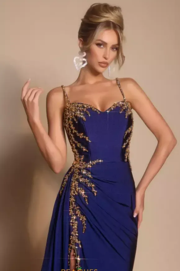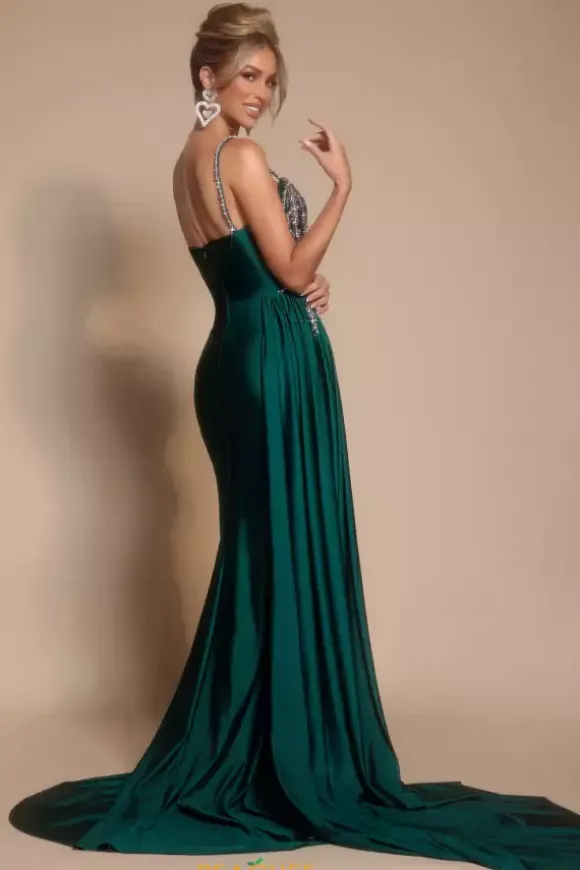 Perfect for any social occasion, this brilliant Portia and Scarlett long dress style PS26304E is made in rich colors of jersey fabric with beaded embellishments along the sides. This impeccable gown features a fitted bodice with beaded spaghetti straps, sweetheart neckline and mid zipper closure back. The long slim skirt has beaded trim along the slit, a draping overskirt on one side and back sweep train.