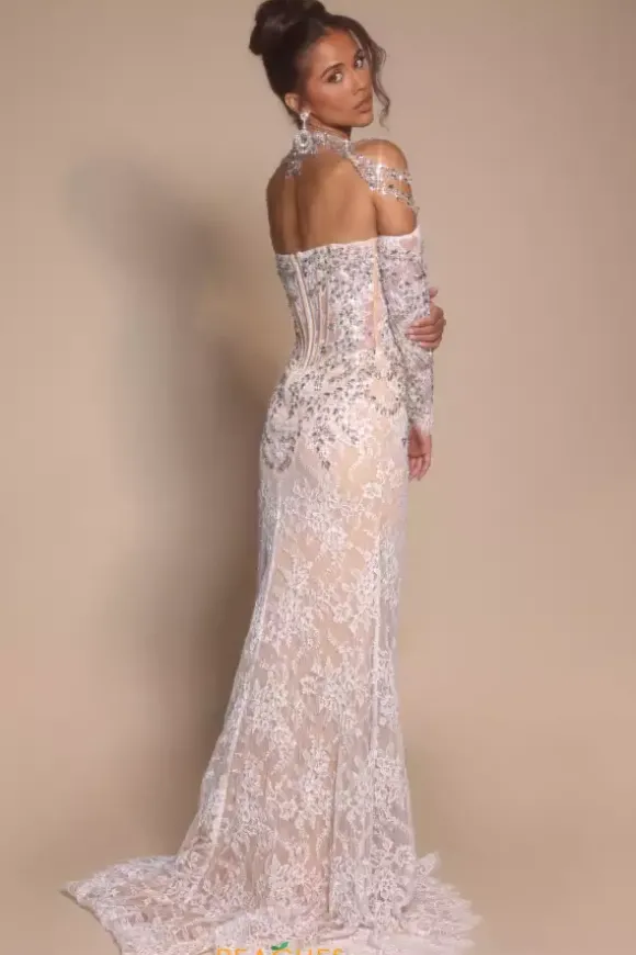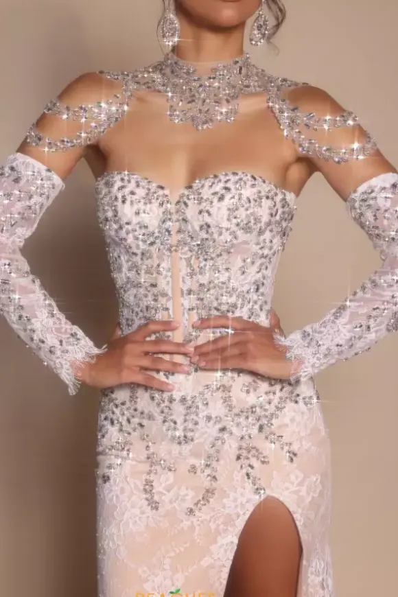 All eye will be on you when you enter the room in this fabulous Portia and Scarltt dress style PS26311E. Made from stunning lace, the strapless sweetheart neckline dress showcases a detachable rhinestone gem necklace and shoulder cap sleeve. Long detachable sleeves add to the glam. The bodice is bejeweled with that amazing stone work.