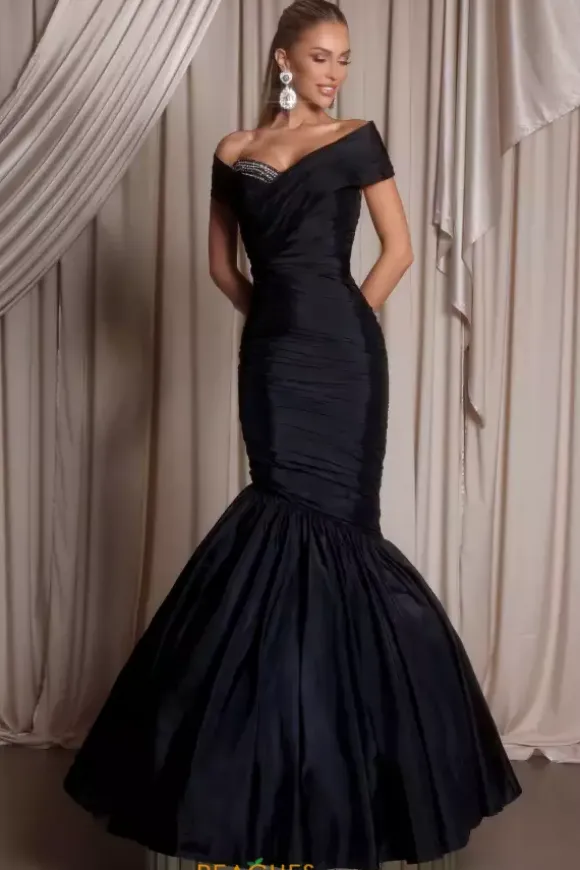 Wear this long elegant mermaid dress for your next special event by Portia and Scarlett, style PS26320E. Featuring an alluring off the shoulder V neckline that goes into a back zipper for a snug fit. Made from tafetta and is almost entirely beadless besides small work of beadwork along one side of the neckline.