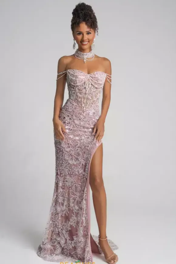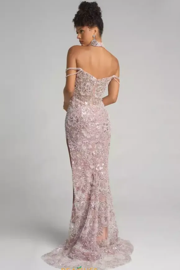 Look and feel like a Hollywood star in this impeccable Portia and Scarlett long dress style PS26322E adorned with appliques, sequins, pearls and beads throughout. This scintillating gown showcases a strapless fitted bodice with a sweetheart neckline, beaded choker collar and draping off the shoulder pearl cap sleeves. The long slim skirt has a dramatic side slit and back sweep train.