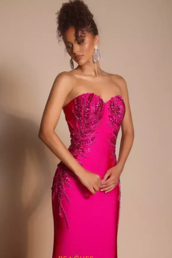 Channel your inner fashionista when you show up to your special event in this chic Portia and Scarlett long dress style PS26331E. The strapless sweetheart neckline dress is made from a stretchy jersey material. The beautiful rhinestone beading adorns the dress starting at the bust and continue down the long side of your hips.