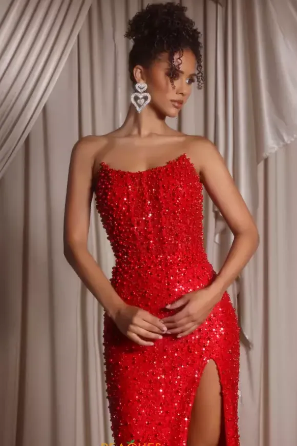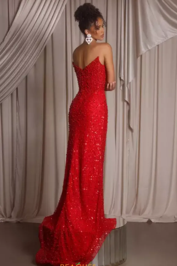 Sparkle from head to toe in this all over sparkle Portia and Scarlett long dress style PS26400C. The strapless scoop neckline bodice is bedazzled with tone on tone beadwork. The mixture of beads, sequins and pearls give it the right amount of shimmer and glisten. The front thigh high slit leads to a long train.