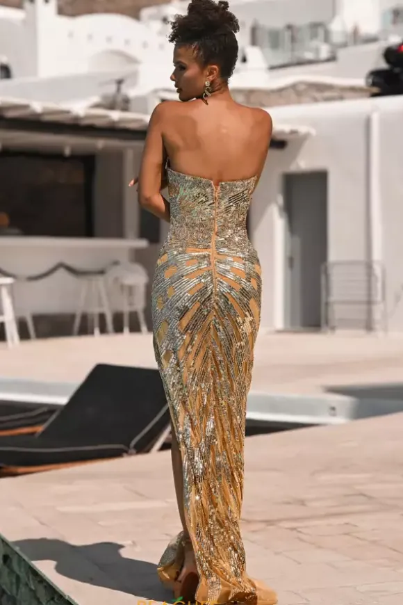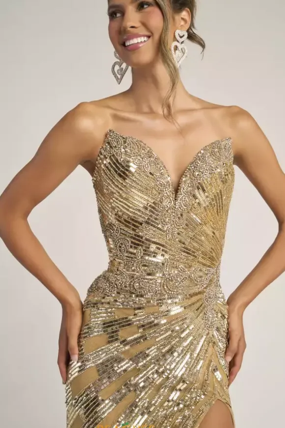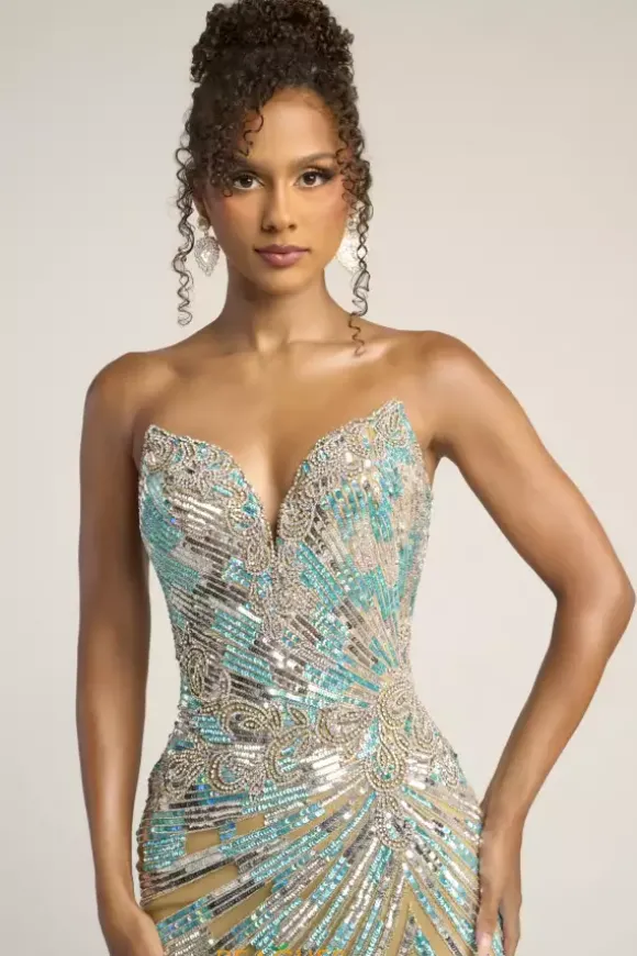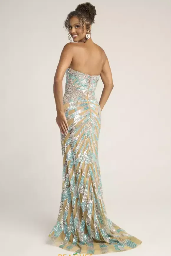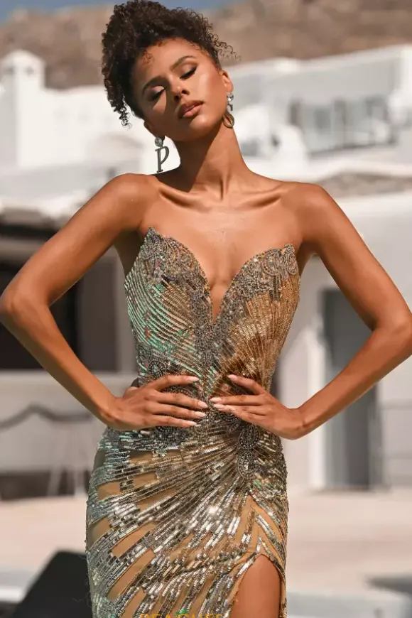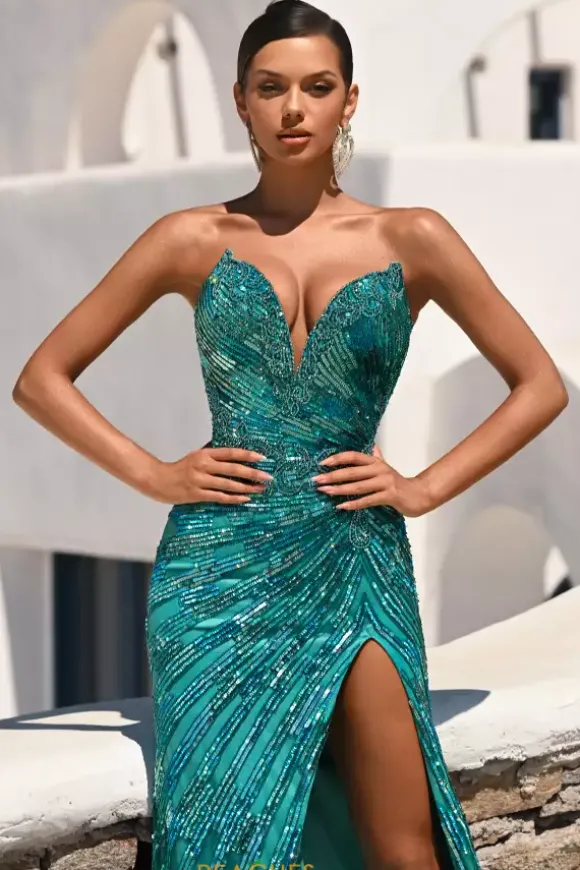 Stand out from the crowd by wearing this shimmering Portia and Scarlett long dress style PS26413C adorned with slimming lines of sequins and scrolling bead work. This scintillating gown showcases a fitted bodice with a V neckline and low back with zipper closure. The long slim skirt has a high front side slit and horsehair hem edge.