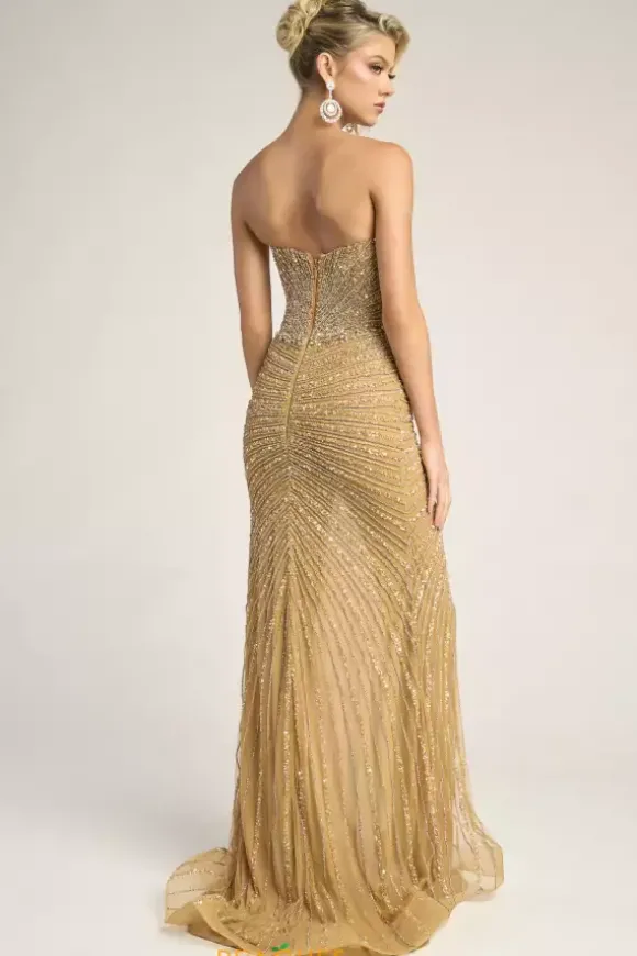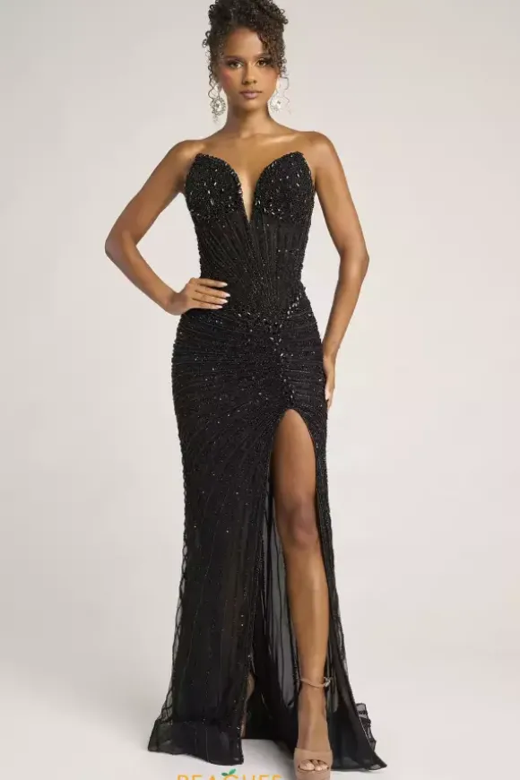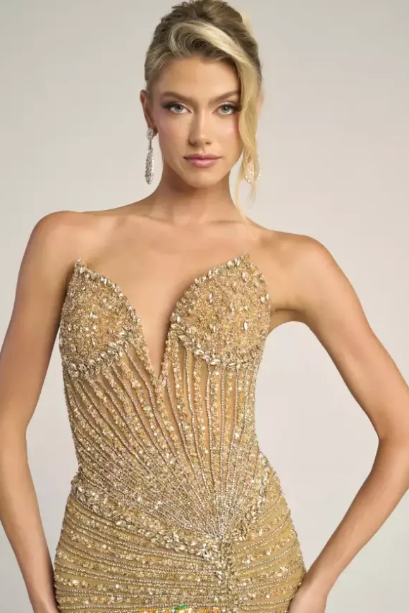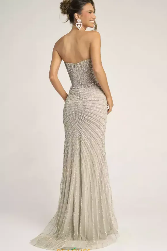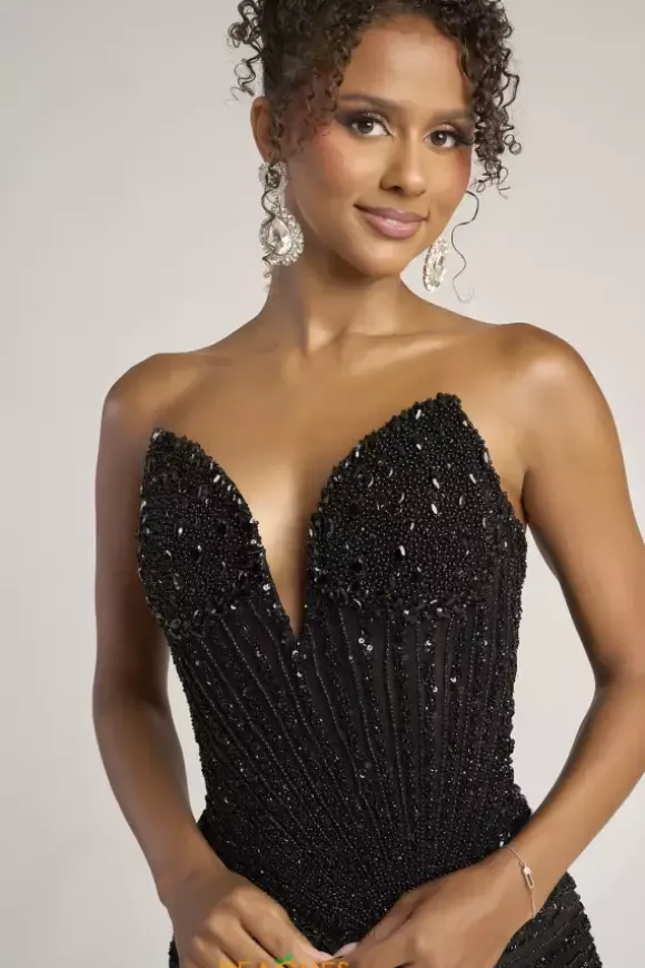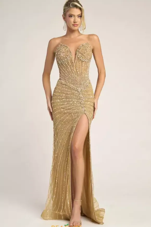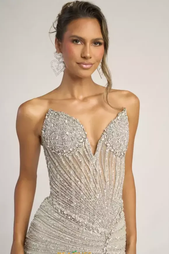 Radiate elegance when you wear this mesmerizing Portia and Scarlett long dress style PS26416C embellished with lines of tonal beading and stones. This scintillating gown showcases a strapless corset with a deep V neckline and low zipper closure back. The long, slim skirt has a high front, side slit and small sweep train.