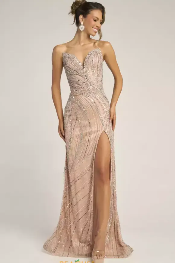Sophistication exudes when you wear this stunning Portia and Scarlett long dress style PS26417C adorned with swirling lines of bead work and stones that enhance your figure. This impeccable gown features a fitted, strapless bodice with a V neckline and zipper closure back. The long slim skirt has an edgy front, side slit and back sweep train.