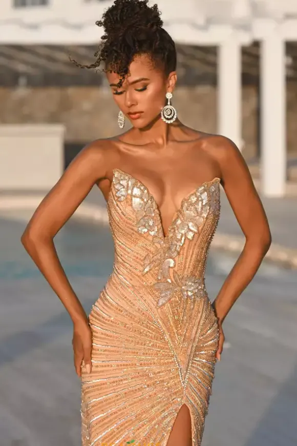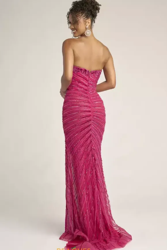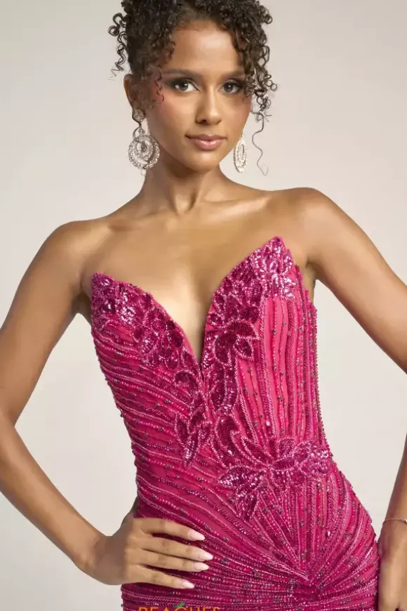 Turn heads at your next social occasion in this dazzling Portia and Scarlett long dress style PS26422C adorned with slimming lines of beads and stones with sequin appliques. This glistening gown showcases a fitted, strapless bodice with a V neckline and mid low zipper back. The long slim skirt has a front, side slit and sweeping back train.