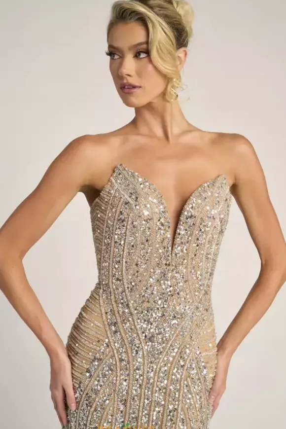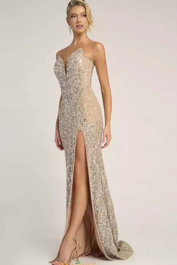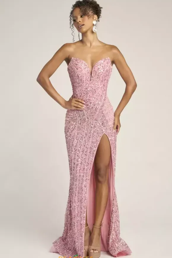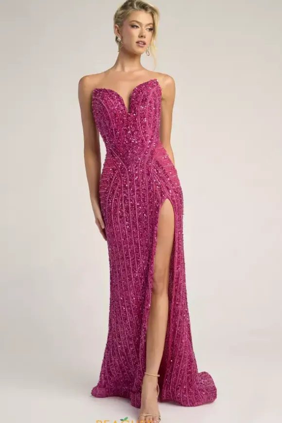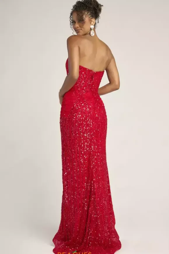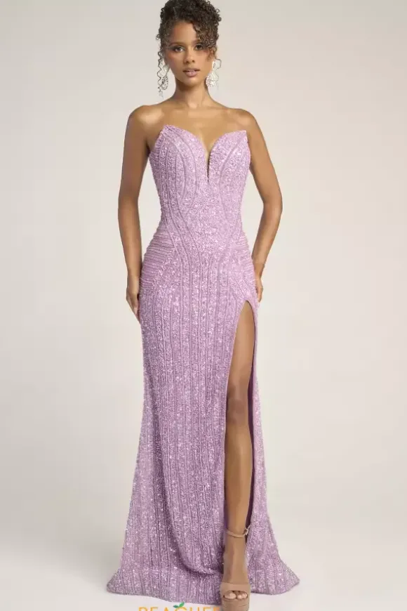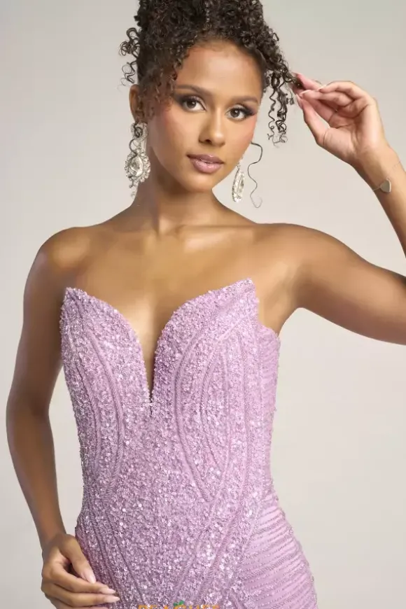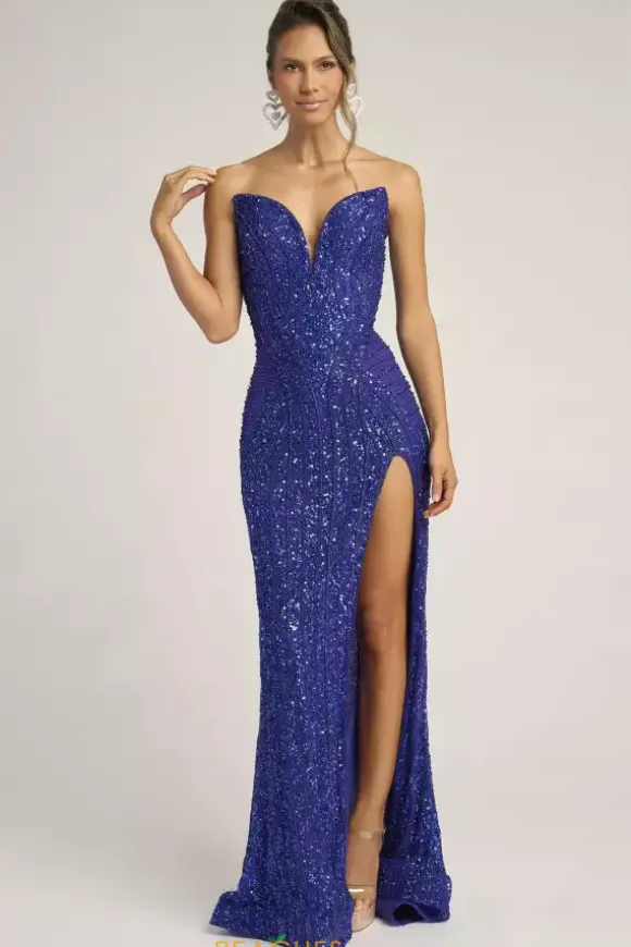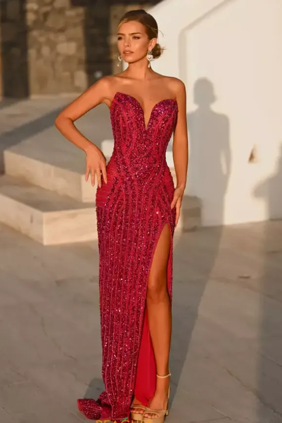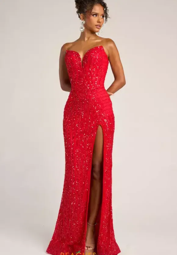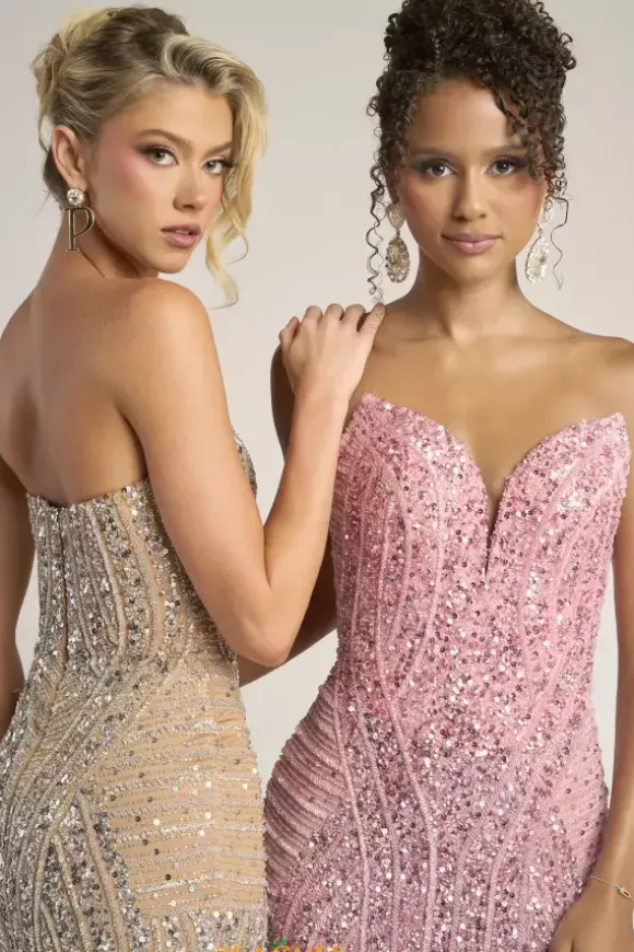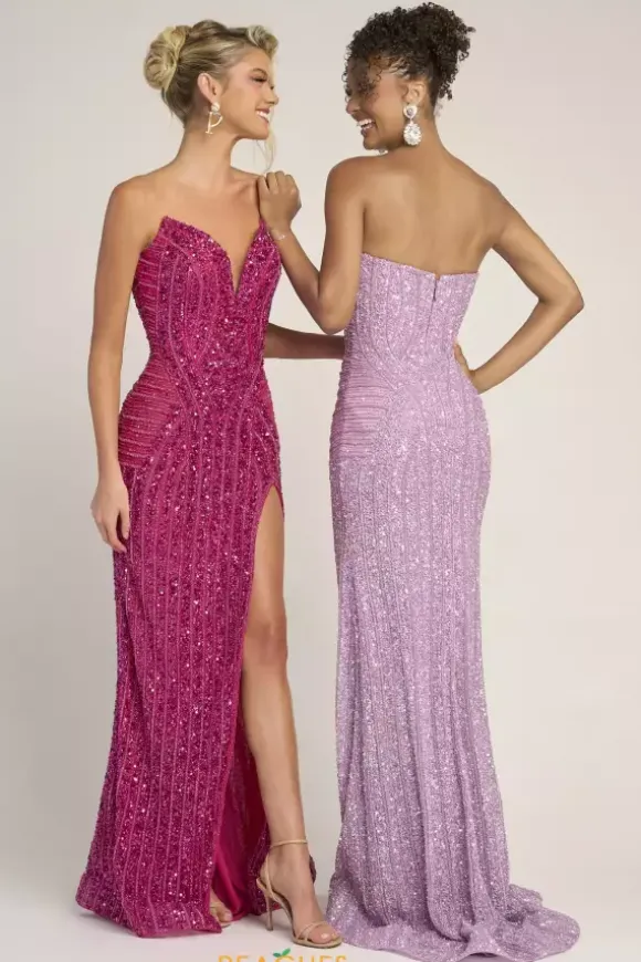 Dazzle and glow all night long at Prom in this scintillating Portia and Scarlett long dress style PS26424C completely covered in sequins and beads that highlight your figure. This astonishing silhouette showcases a fitted strapless bodice with a V neckline and low zipper closure back. The long slim skirt has a edgy front side slit and back sweep train.